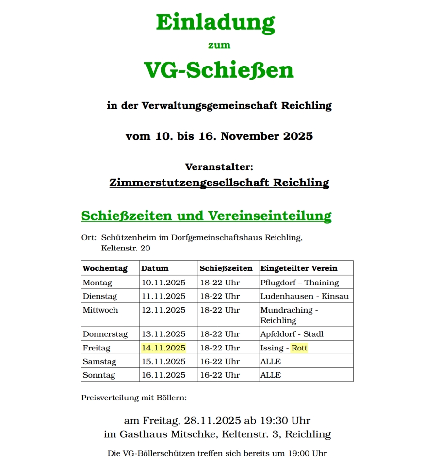 Die Schützengesellschaft Diana Issing lädt im Zeitraum vom 03. – 13. April 2025 zum Schießen der Verwaltungsgemeinschaft Reichling ein.