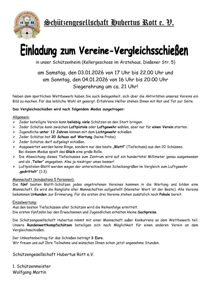 Die Schützengesellschaft Diana Issing lädt im Zeitraum vom 03. – 13. April 2025 zum Schießen der Verwaltungsgemeinschaft Reichling ein.